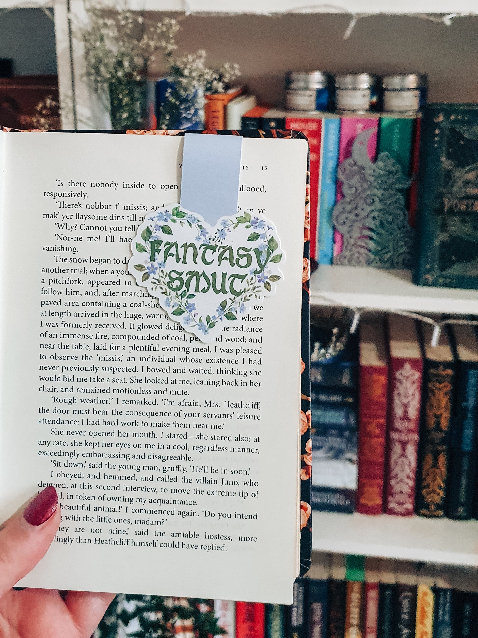 Magnetic bookmark with cottagecore floral and vine heart design that says fantasy smut